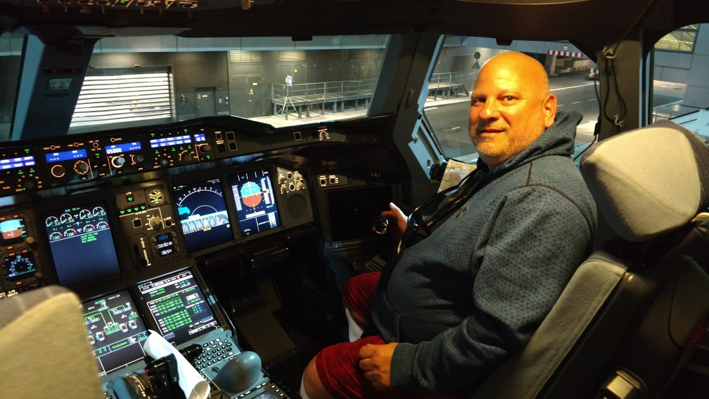 Dan at the controls of a Lufthansa A-380 at Frankfurt Airport.