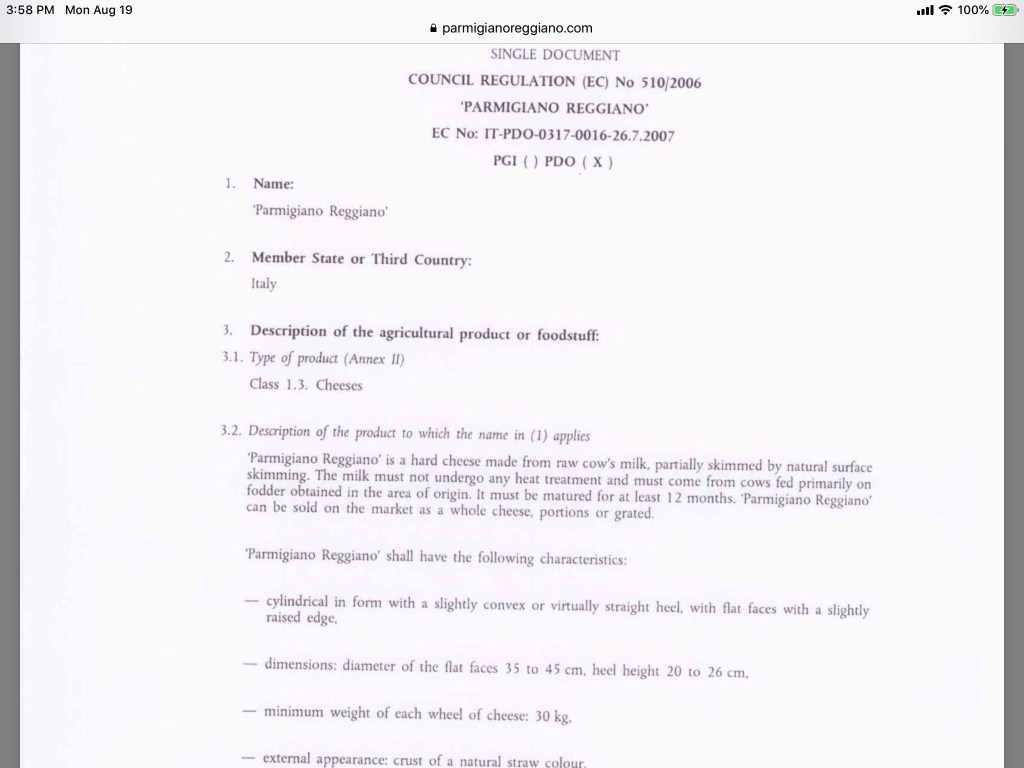 Specification for Parmigiano Reggiano DOP defining the terriroty of origin and production methods & requirements.