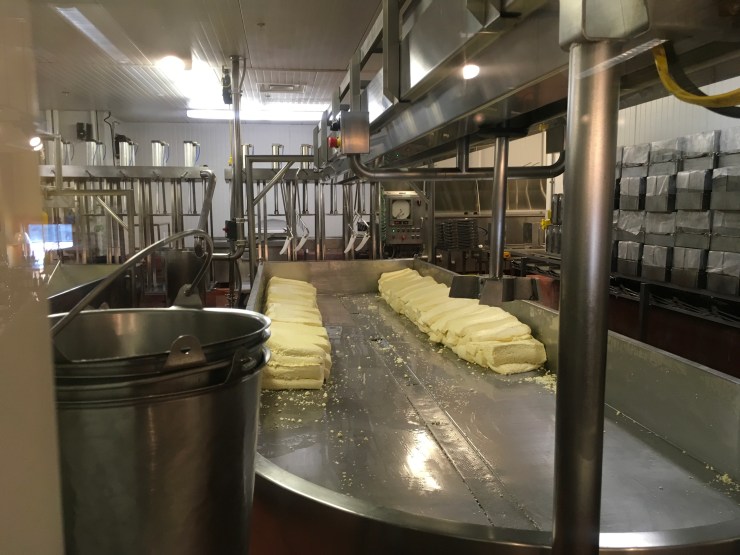 The curds are stacked 4 high. Each of those tossed curd pieces weighs about 25 pounds. when they have the right consistency they go into the shredder which makes “fingers” out of the curds.