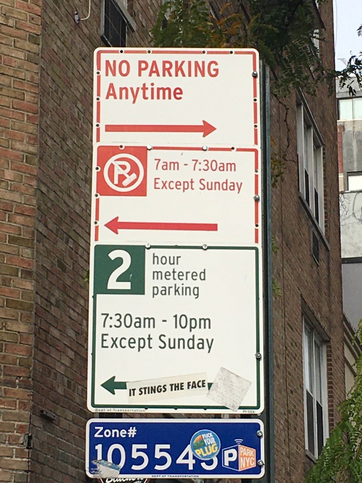 As a Native New Yorker, I can park and swagger away confident that my deciphering skills are finely honed. I won’t come back to find a $145 bright orange violation or an empty space where I left my car. That’s not always true, one time I came back to my car to find a ticket on it and the meter still had time on it. The meter maid was working on the next car and I asked him to look. He said the ticket was valid. The meter THEN clicked to expired. He said “See, it’s expired” and walked away from me.