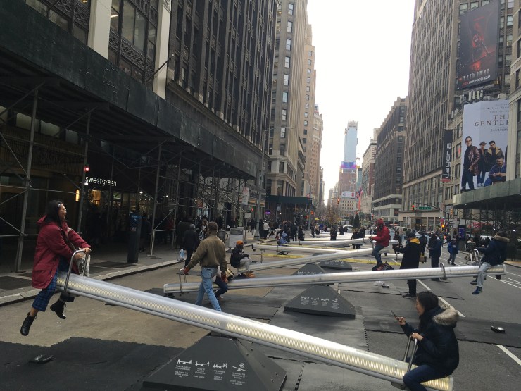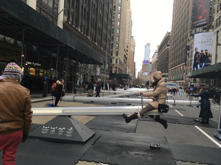 what you find is there’s all kinds of styles of see sawing. in the above photo one must take a selfie whilst see-sawing on broadway.