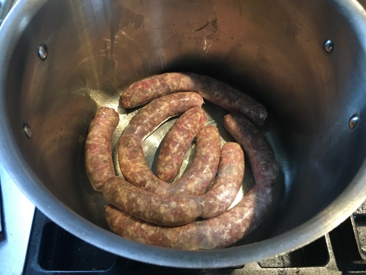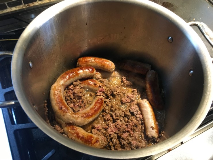Home made Roasted Tomato Sauce with home made sweet Italian Sausage and ground sirloin. Dan