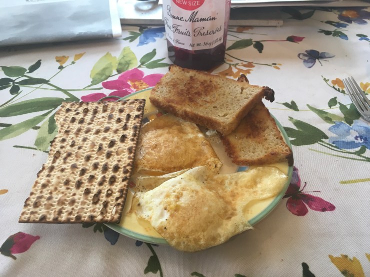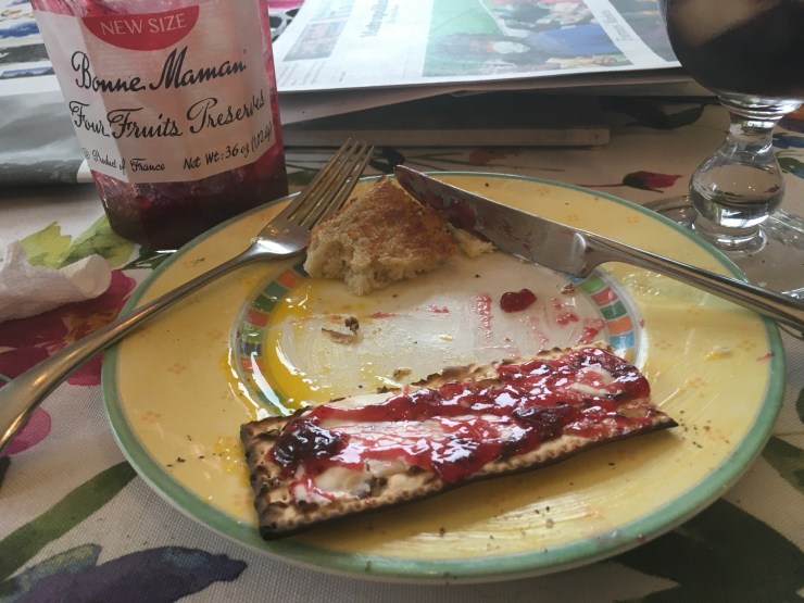 Every year my genes rattle around inside of me and I get an urge to buy a box of matzoh. And I eat it with Butter and jelly. There are many other things you can do with Matzoh. You can make matzoh balls (no the matzoh balls are not contained in the scrotum of the matzohs). Matzohs don’t have scrotums). You can make matzoh brie (prounounced “eye” with a BR in front), which my father liked to do on weekend mornings during passover. Dad like to make breakfasts. I hate matzoh brie, which is like matzoh pancakes, you eat it with cinnamon and sugar instead of Aunt Jemima Syrup and you only need one bite, it sits in your belly like lead and you’ll be full for a week. It’s awful!