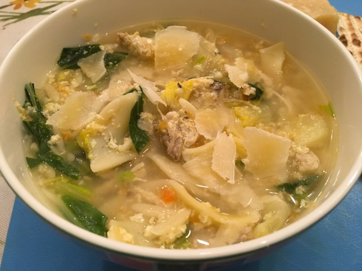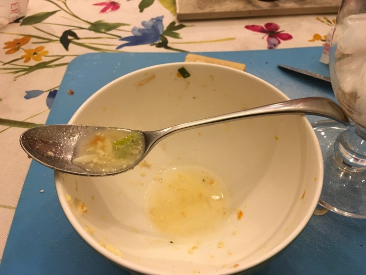 While Winston ate alone upstairs in his safe space, I came downstairs and made my self the last of the last batch of chicken soup (that i make from scratch). Making chicken soup is somewhat ordinary for me. I make a gallon at a time, then use the broth to make a variety of other things. Pan sauces, avgalemeno soup, and my favorite, chinese vegetable egg drop soup – which is how this gallon finished.
