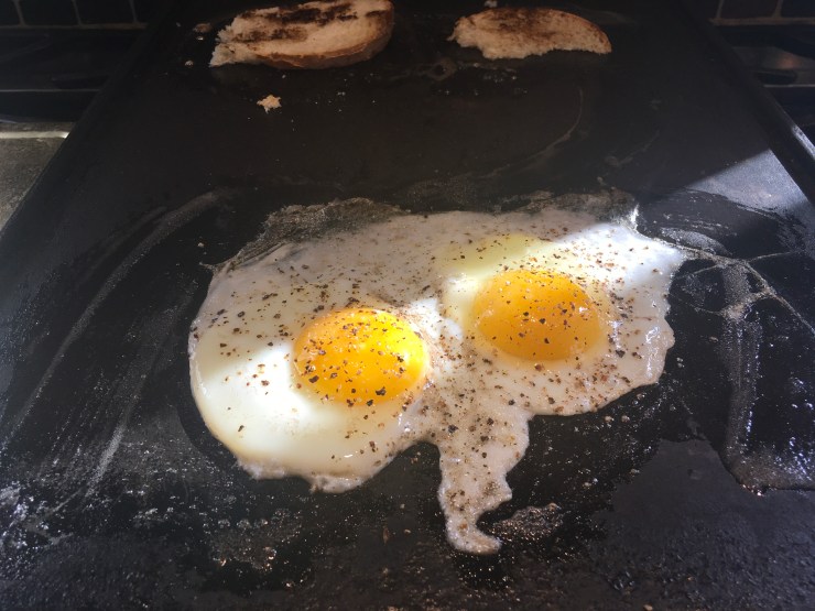 All this baking has me concluding I’m eating too many carbs. I have to cut down. I go downstairs to the kitchen intent on making a plain couple of eggs, like I did when I first got here. Well you know what they say: “The road to hell is paved with good intentions.”